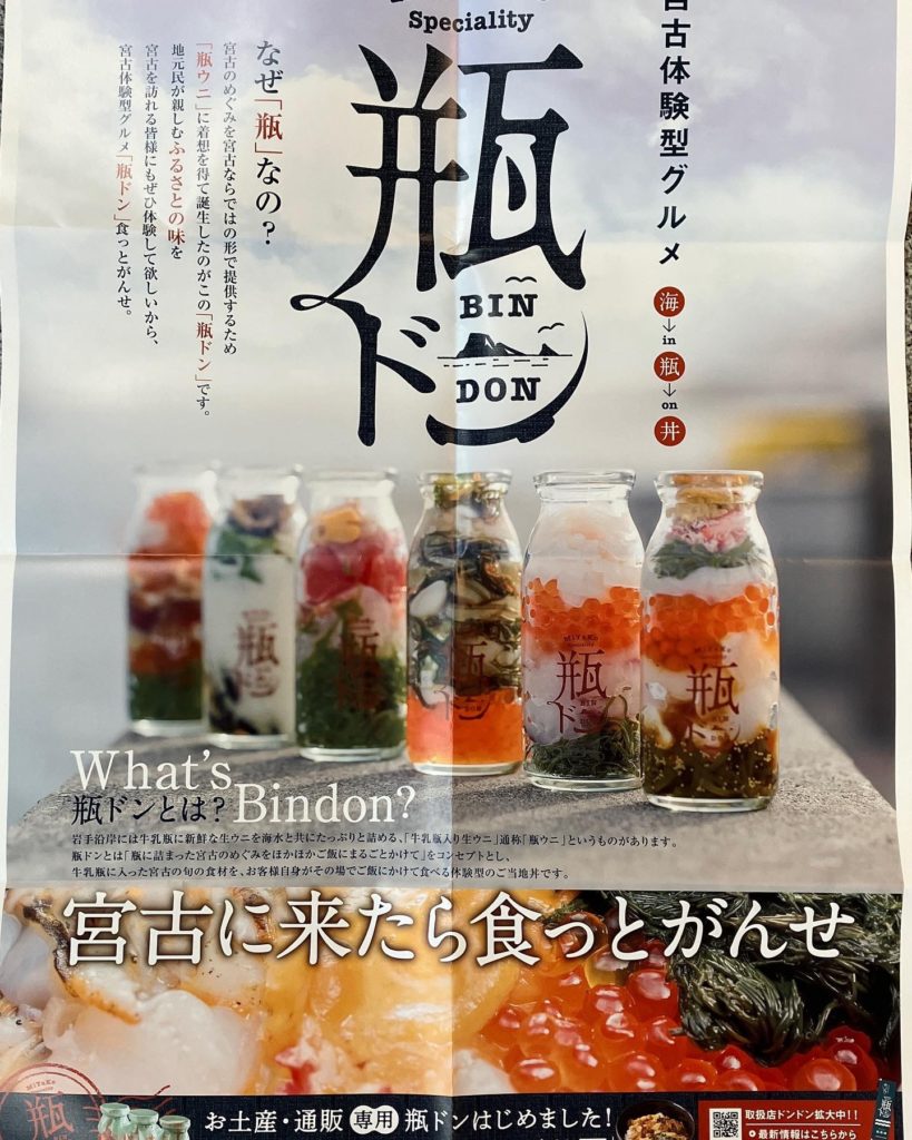 岩手県宮古市の新名物「瓶ドン」が数量限定しました!三陸が誇る新鮮な海の幸を牛乳瓶にギュッと詰めたものです。味付きですので、ご飯の上に盛り付けてお召上がりください。ヒルナンデスなど様々なメディアにも取り上げれた瓶ドン。数量限定ですので、お早めにお求めください。